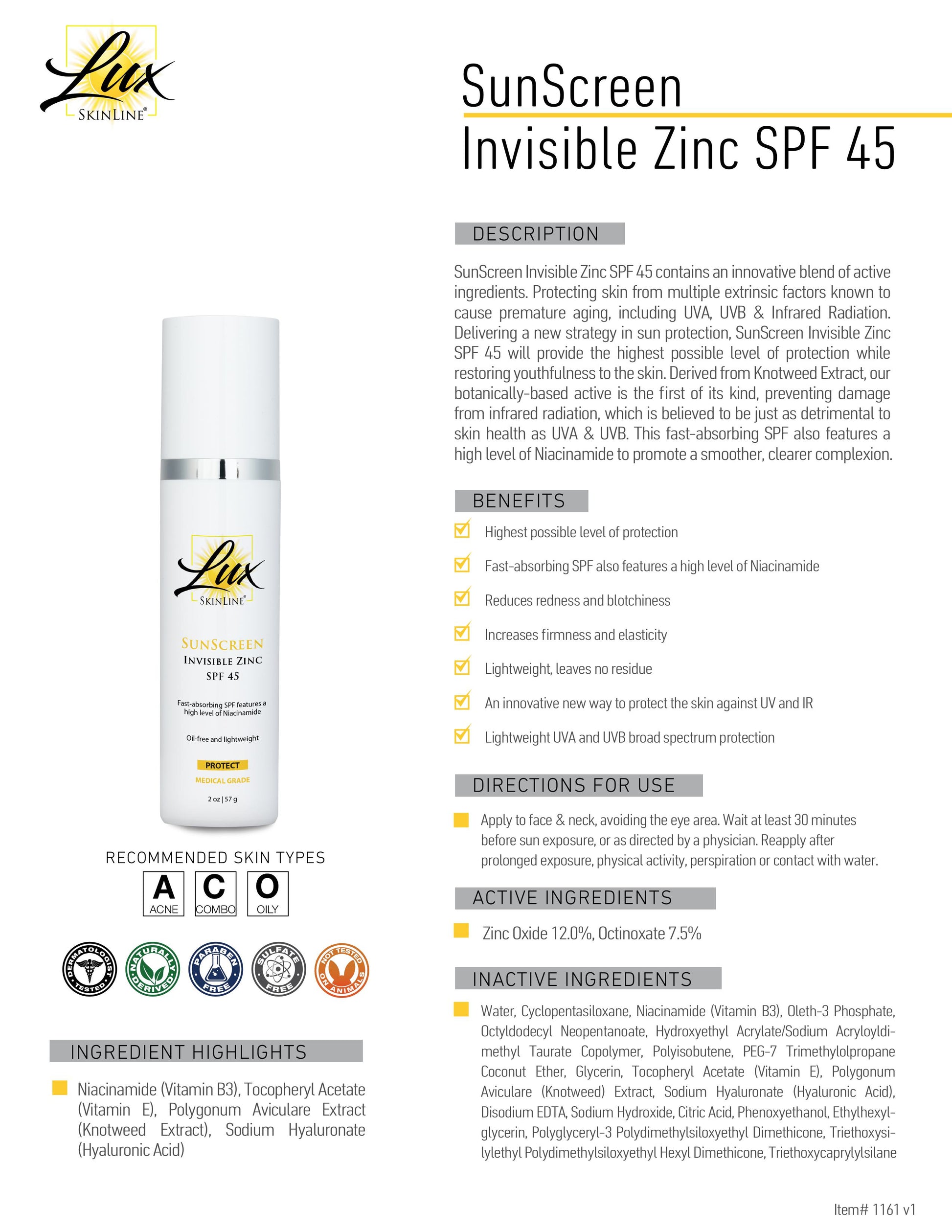 SunScreen Invisible Zinc SPF 45 contains an innovative blend of active