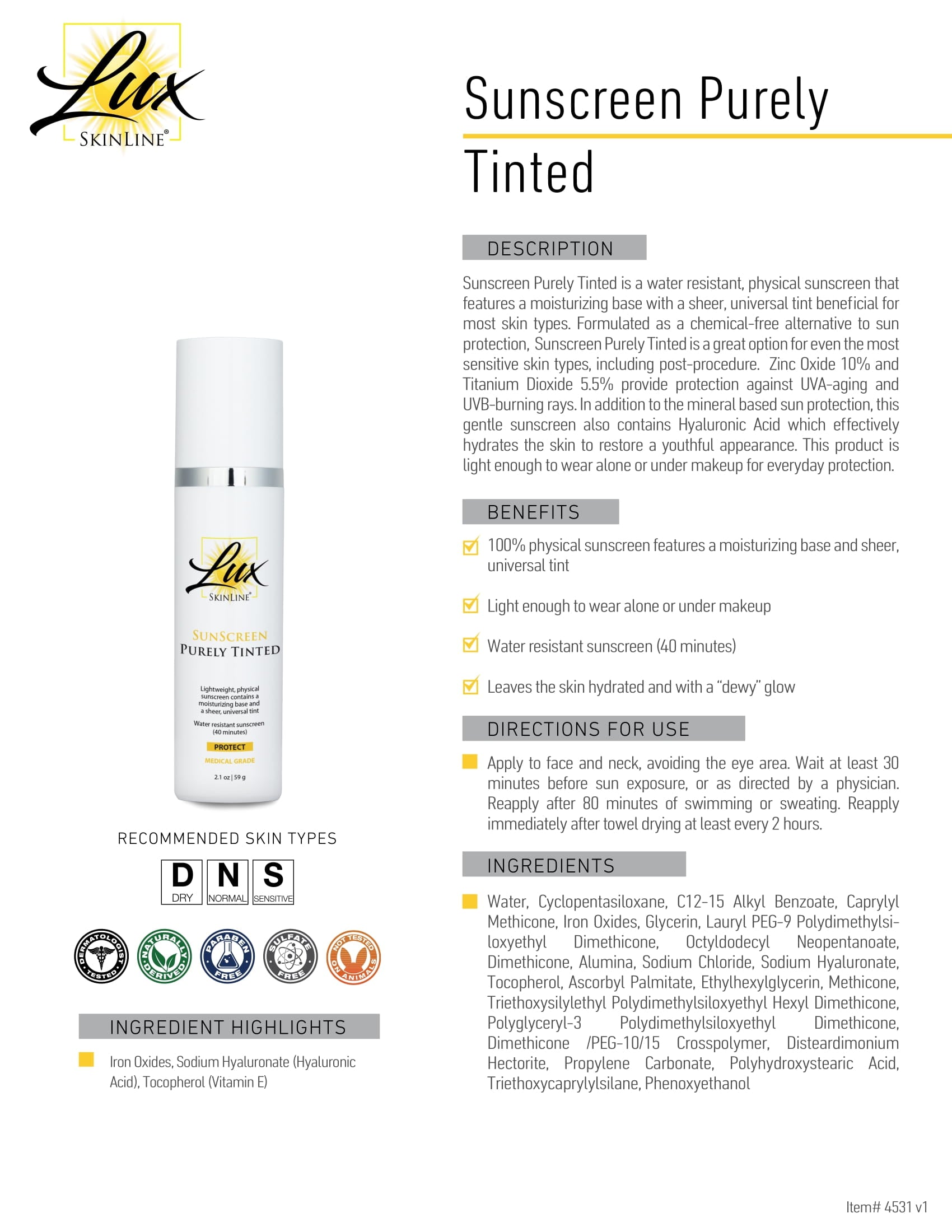 Purely Tinted SunScreen is a water resistant, physical sunscreen that
